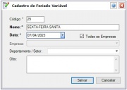 | 17h35min de 16 de janeiro de 2023 | Cadastro de Feriado Variavel.jpg (arquivo) | 27 KB | Elisangela | 1 | ||